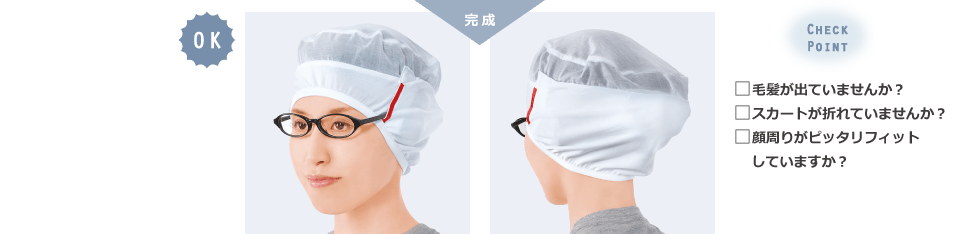 毛髪が出ていないかチェックし、正しい位置でかぶれているかを確認。